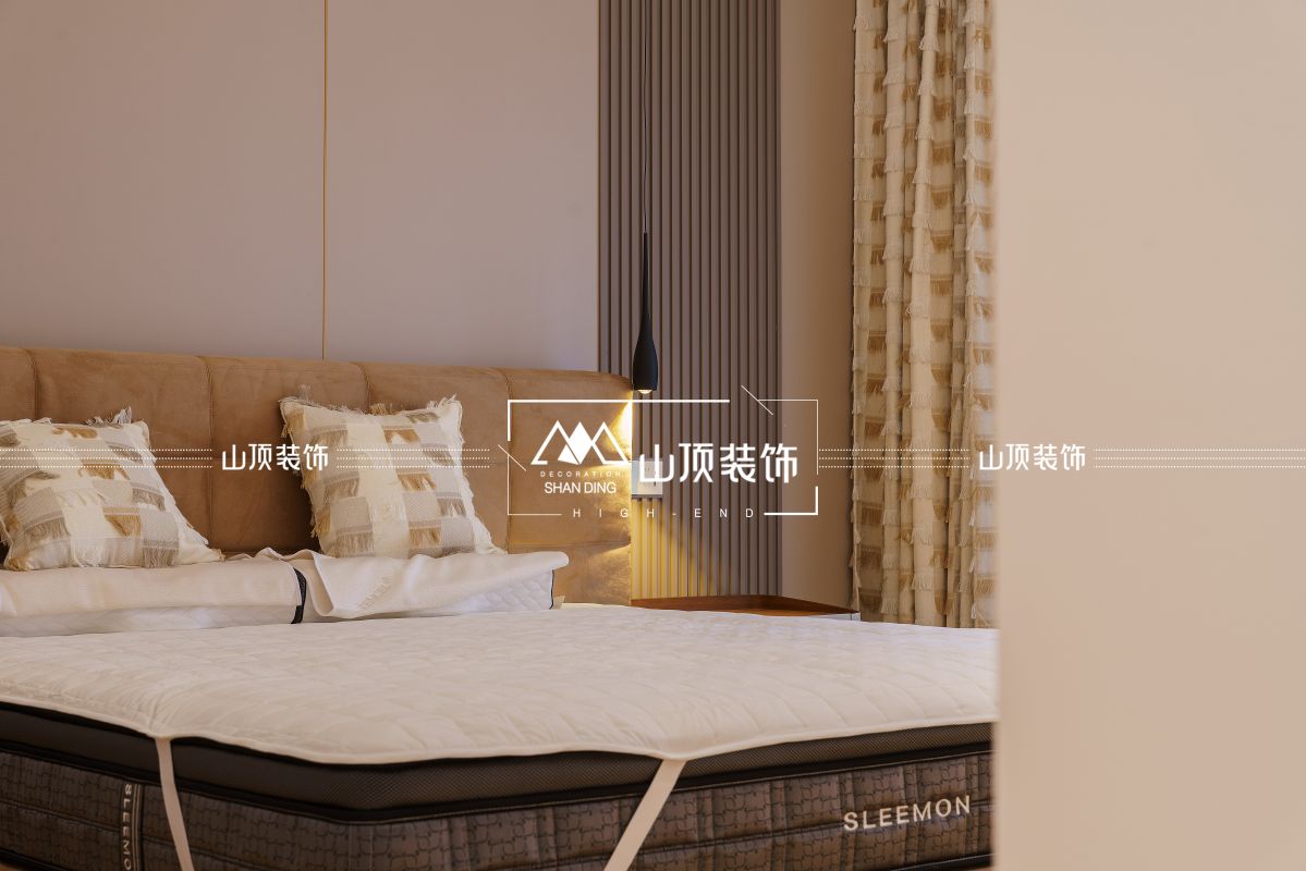 卧室以简约设计诠释空间的本真之美,无主灯设计以隐藏光带与局部吊灯勾勒空间轮廓,日间柔光透过纱帘倾泻,夜间暖调灯芒晕染,形成昼夜交替的诗意韵律。