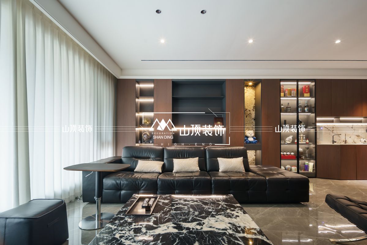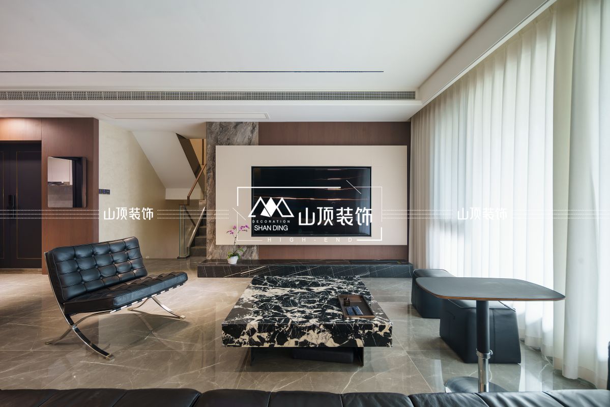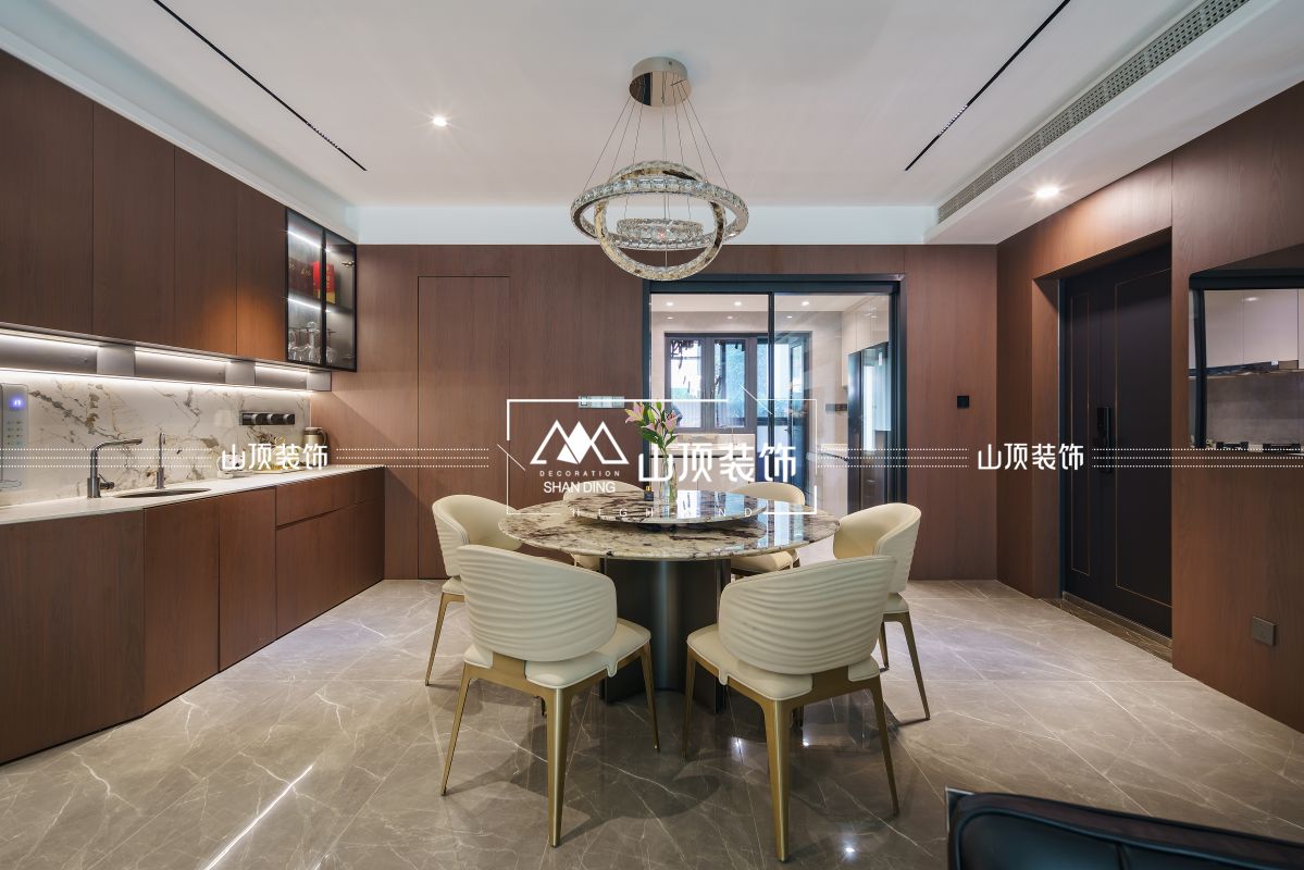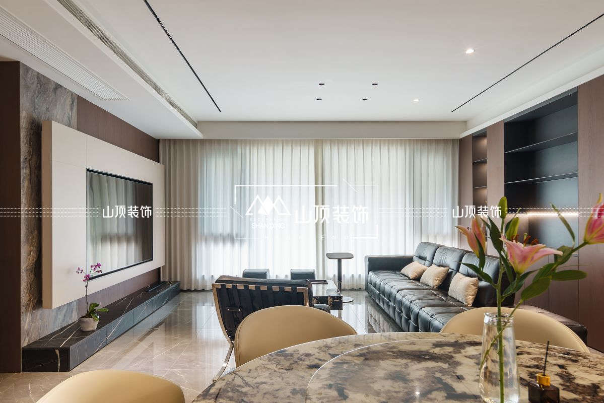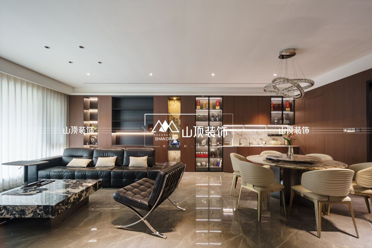 深色皮质沙发与黑白石材点缀出低调的奢华感。整墙收纳系统结合木饰面一体化设计,在保持视觉纯净的同时,满足实用收纳。餐厅的半开放格局维持了用餐的仪式感,亦与客厅、楼梯间形成视觉联动,增强空间通透与互动。