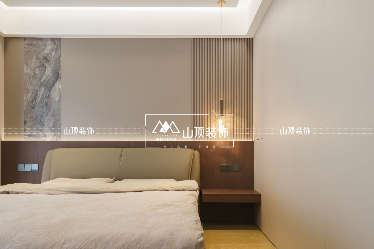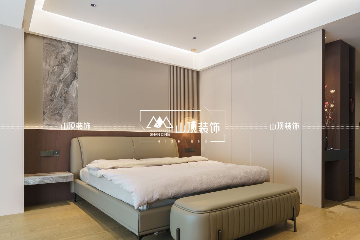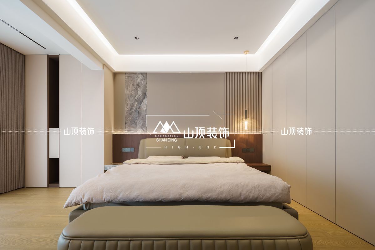 睡眠区以米色为主调,营造宁静舒缓的休憩环境,床头背景墙通过不同材质的拼接,丰富视觉层次。端景另一侧连接步入式衣帽间,提供充足收纳,空间整洁而有序,让卧室真正成为身心回归的静谧之地。