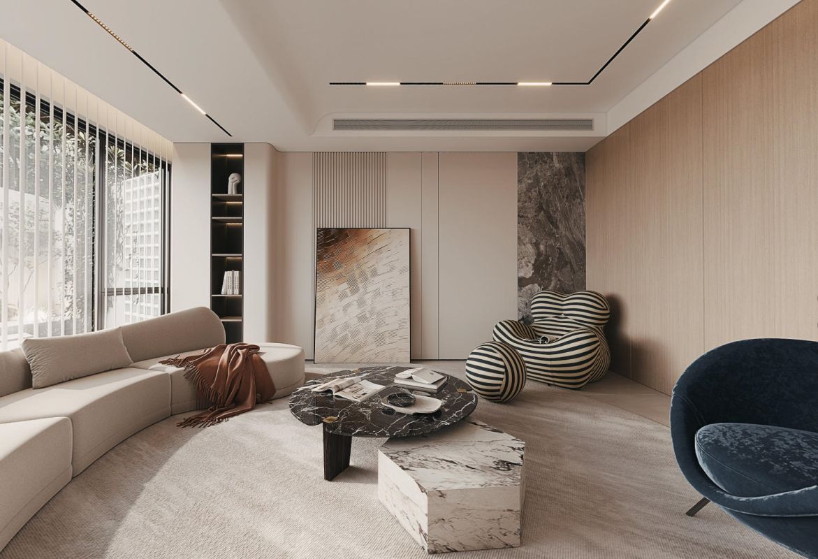 本案以米白、浅木色与灰调铺陈出宁静包容的中性底色,如一张温暖画布,静待生活落笔。