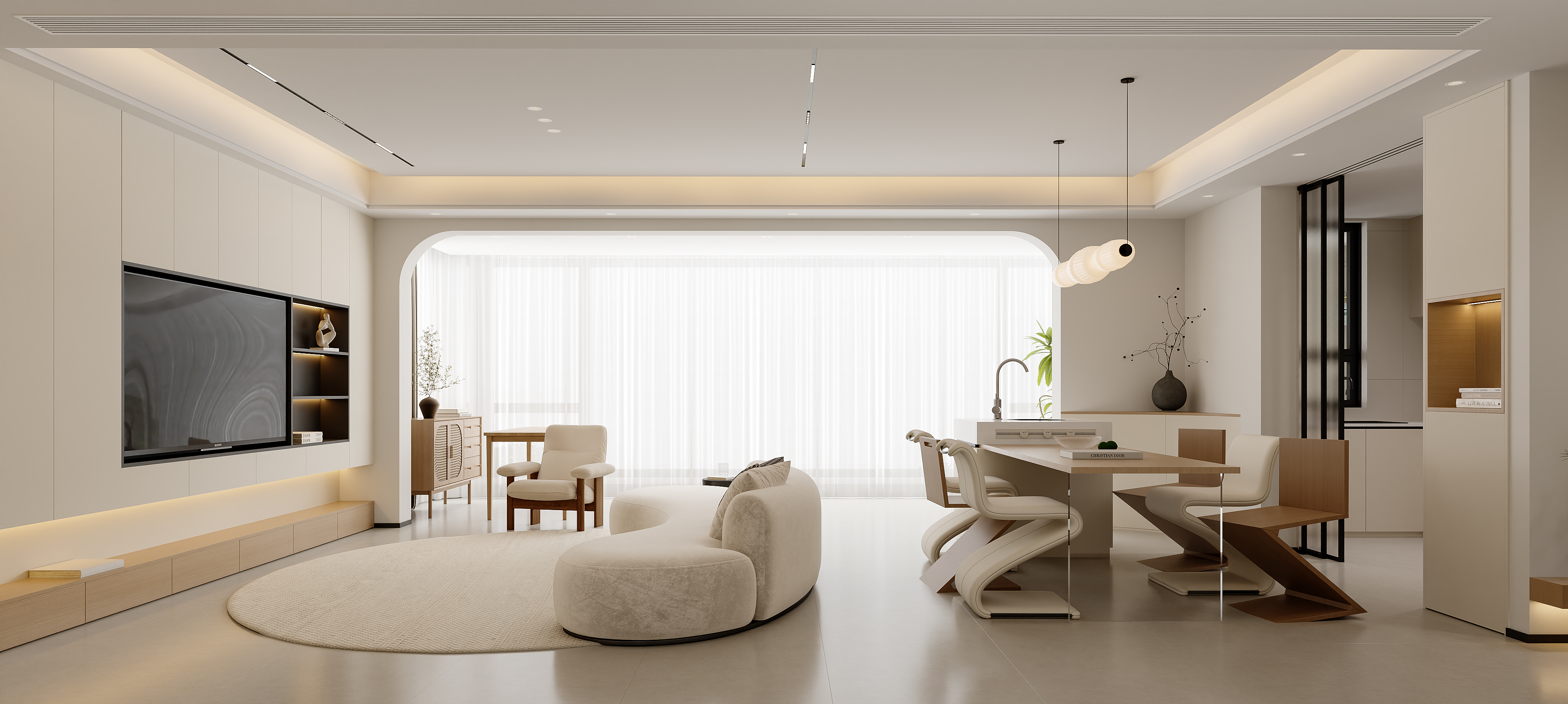 打破传统界限,客餐厅以一体化布局构筑出一个澄净温润的生活场域。设计上大量运用曲线语言:餐厅内,云朵堆叠般的吊灯轻盈垂落,与Z型椅的流畅弧线相映成趣;客厅中,弧形沙发如涟漪般围合出温馨的交流场域,搭配肌理丰富的编织地毯,为极简空间注入手作温度。