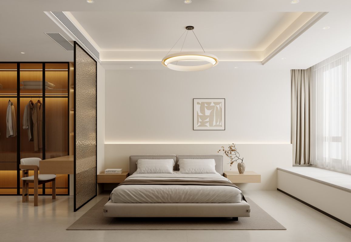 卧室与衣帽间之间以冰晶玻璃隔断划界,既维系空间开敞度,又令光线自如流淌,营造出通透轻盈的视觉氛围。主卫以简约现代的设计演绎精致生活美学,浅米色基调铺陈温暖洁净氛围,暗藏灯带与百叶窗光影交织,在开放与私密间觅得平衡,打造出令人放松的洁净仪式空间。
