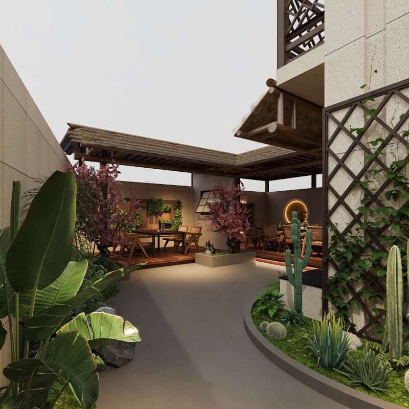 户外花园以东方禅意为骨,自然生机为韵,铺就一方都市里的诗意茶境。竹影围合出静谧天地,花木错落成趣,木桌藤椅静候茶客,圆窗映桃、灯串缀檐,每一处都藏着中式雅致。