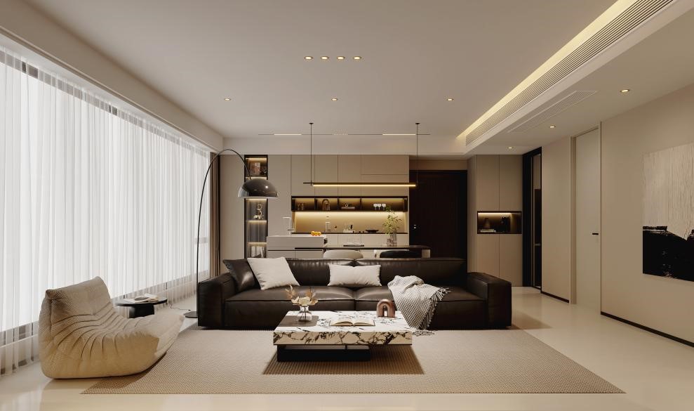 吊顶凹槽嵌入暖白灯带,向上漫射洗亮墙面。观影时关掉主灯,只留背景墙微光——Nv1设计团队从硬装到软装统筹,确保效果图完美落地。